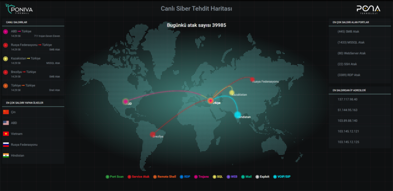 PONIVA Firewall bulut tabanlı merkezi siber güvenlik özelliği ile cihazlardan herhangi birisine saldırı olduğunda bu saldırı merkeze bildirilir ve tüm firewall cihazları saldırgan ip ile iletişimi keser.
